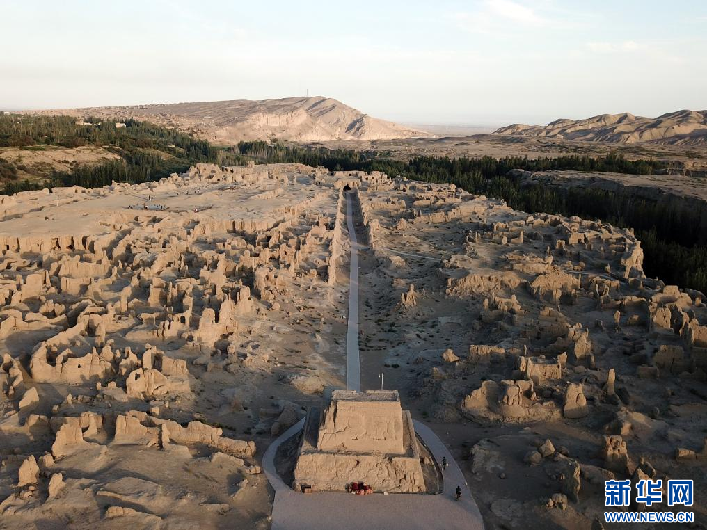 8月11日拍摄的夕阳下的新疆交河故城(无人机照片)。新华社记者 马宁 摄