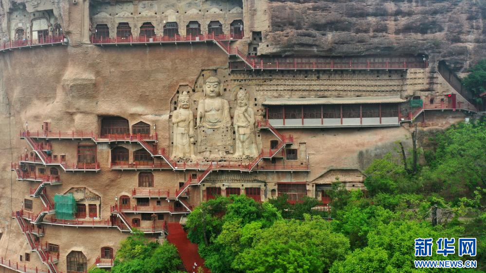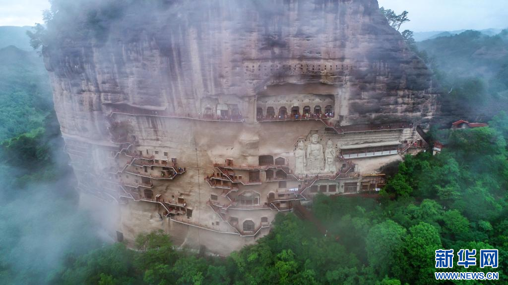 这是5月31日在甘肃省天水市拍摄的烟雨笼罩下的麦积山石窟(无人机照片)。新华社记者 郎兵兵 摄