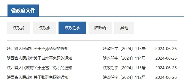 6月26日,陕西省人民政府网站发布一批人事任免通知。