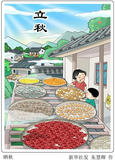 “一叶梧桐一报秋,稻花田里话丰收。”华东师范大学民俗学研究所教授田兆元表示,在古代,立秋是“四时八节”之一,格外受重视。在此时节,民间有很多传统习俗,比如“晒秋”。这指的是农民会将农作物如玉米、辣椒等拿出来晾晒,色彩斑斓、景象美丽,以此来展示丰收成果,寄托对新一季丰收的祈愿。