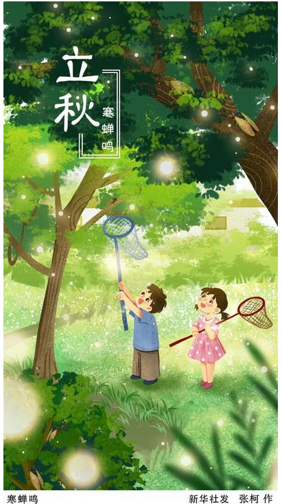 我国古人将立秋分为三候:一候凉风至,二候白露生,三候寒蝉鸣。立秋前五日,风吹过脸庞,有了丝丝凉意,暑热已经没有原来那么张狂了;又过五日,由于昼夜温差拉大,地表水蒸气在低温下凝结,早晨会产生雾气,所以叫白露生;再五日,秋蝉感觉到阴气上升、昼热夜凉,于是争相嘶鸣,但一日比一日减弱。秋蝉,也叫“寒蝉”“暮蝉”,其叫声提示天气真的开始变凉。