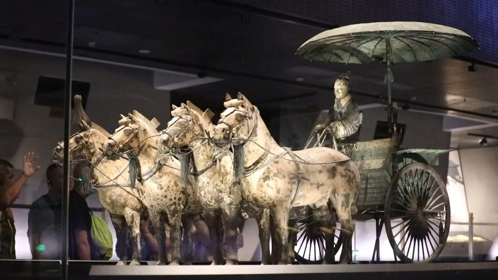 1980年,在秦始皇陵车马坑中出土了两乘大型彩绘铜车马,经过近8年修复,它们终于重现了始皇銮驾的风采。秦陵铜车马结构完整、装饰华丽,雕塑精美,铸造工艺精湛,被誉为“青铜之冠”。