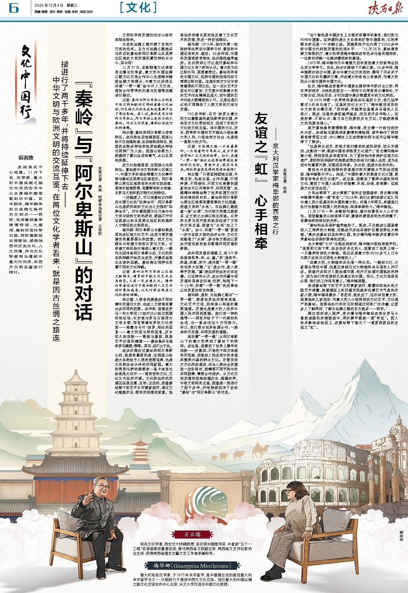 我沿着“一带一路”,从阿尔卑斯山下的意大利来到了秦岭下的陕西。在这里,我看到了世界上最早的戏剧——皮影戏、不逊色于西方油画的农民画、活跃在人民生活中的非遗和繁荣兴盛的群众文化。尽管东西方文化存在差异,但当人类社会发展到一定阶段时,就需要不同节拍中的共同旋律,需要合作进步。从文化交流发展的视角回望历史、展望未来,中欧文明间的互鉴,就像是一场进行了两千多年,并将持续延伸下去的“秦岭”与“阿尔卑斯山”的对话。(记者 柏桦 记者 王若歆)