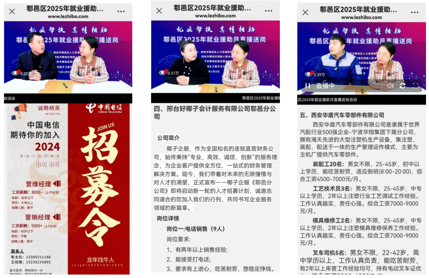 活动采取用人单位走进直播间在线推介岗位的形式,依托西安市公共招聘网、秦云就业、画乡之窗等平台进行线上推介。直播室共吸引了14家企业进入,提供了45个工种、370个就业岗位,岗位覆盖金融、互联网、教育、机械加工等多个行业,其中有4家企业提供残疾人岗位35个,为就业困难群体提供了多元化、高质量的就业选择。直播活动共吸引3.1万余人次在线观看和互动点赞,活动取得了圆满成功。