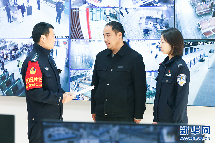 1月14日,2025年春运首日,在西安铁路公安处咸阳站派出所综合指挥室内,旅客前来报警寻求帮助,民警热情解答。新华网 杨喜龙 摄pagebreak