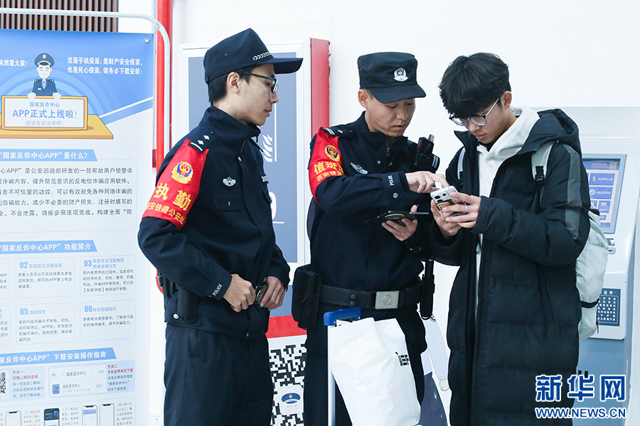 1月14日,2025年春运首日,在咸阳火车站候车室,民警靠前服务,对订票的大学生群体开展反诈宣传。新华网 杨喜龙 摄pagebreak