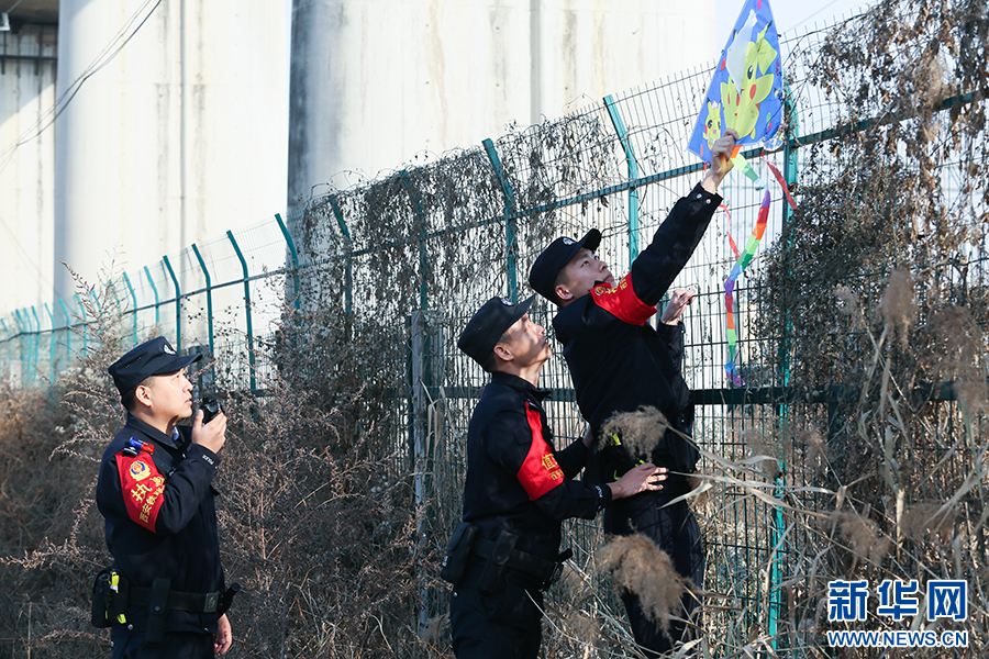 1月14日,2025年春运首日,通过高空视频巡查,民警对铁路防护网上悬挂的异物进行清除,排除线路隐患。新华网 杨喜龙 摄