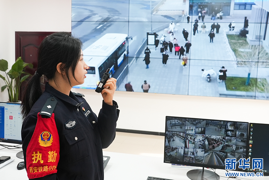 1月14日,2025年春运首日,在咸阳火车站候车室,值班民警通过候车室内实时画面,调度巡逻民警为旅客提供服务。新华网 杨喜龙 摄pagebreak