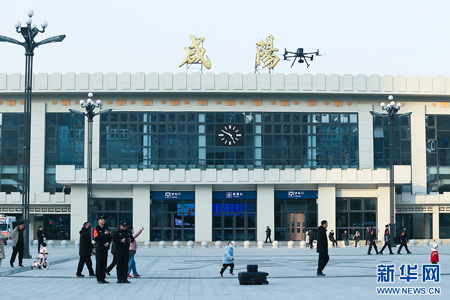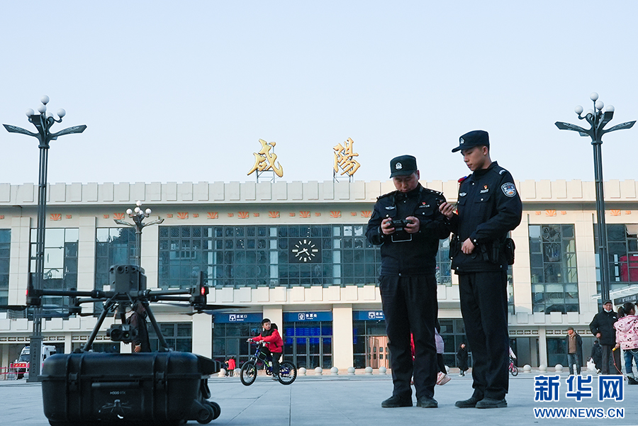 1月14日,2025年春运首日,在咸阳火车站,两位民警放飞警用无人机,对车站进行全视角巡视。新华网 杨喜龙 摄pagebreak
