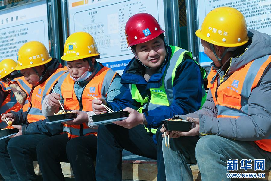 2月9日,在午饭时间,项目经理程林(右二)与施工人员一起吃午饭。新华网 杨喜龙 摄