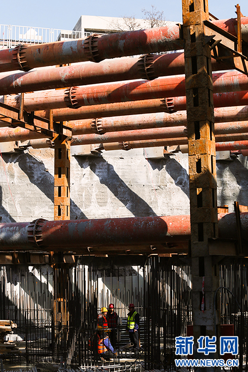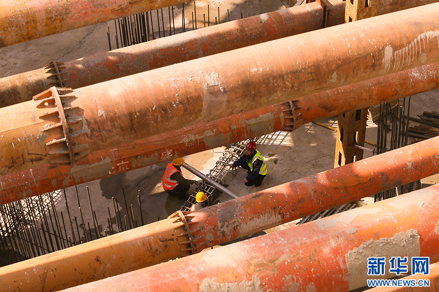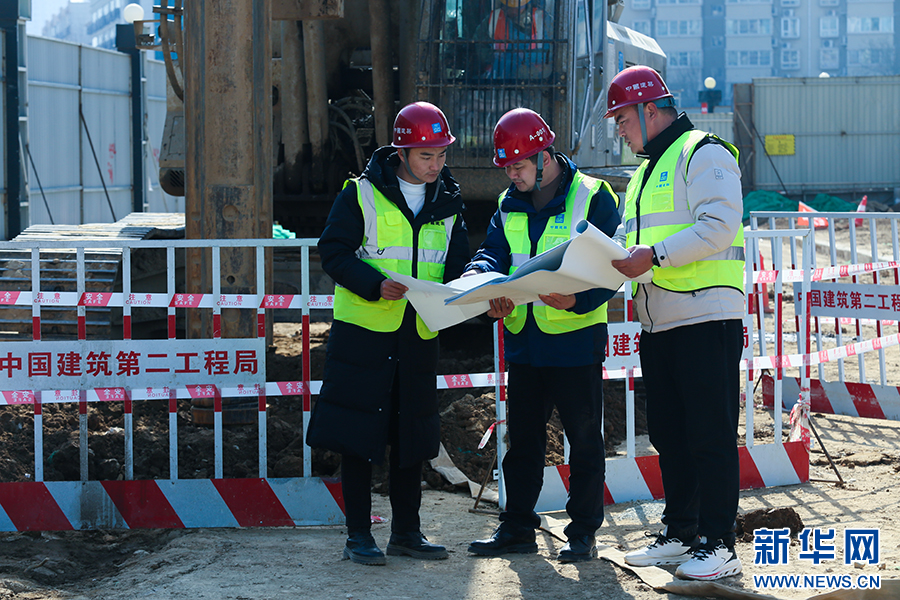 2月9日,项目经理程林(右)与安全监督部门对基坑支护工作进行排查。新华网 杨喜龙 摄