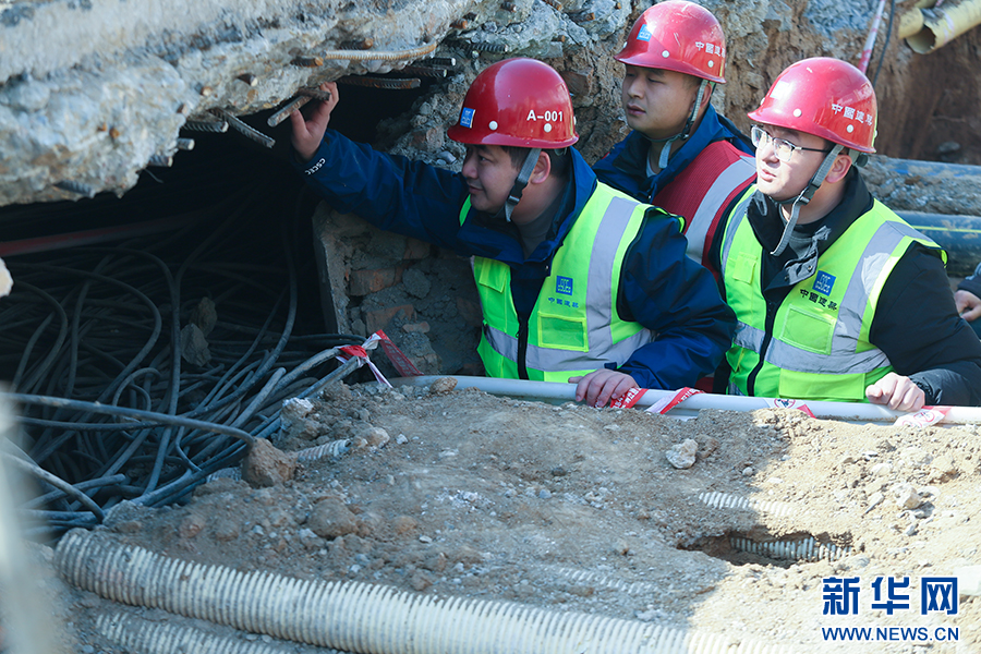 2月9日,项目经理程林(左一)了解现场管线迁改情况。新华网 杨喜龙 摄
