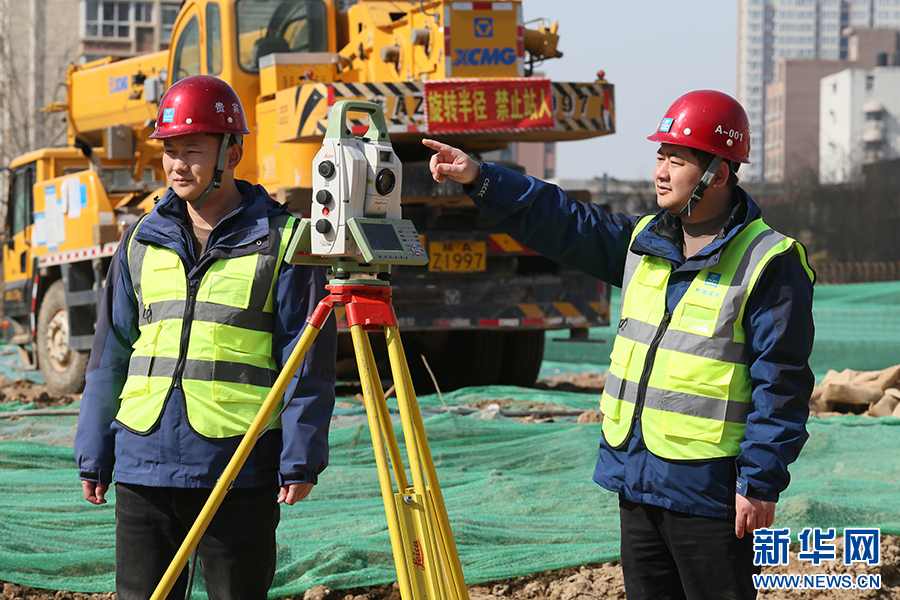 2月9日,项目经理程林(右)对测量工作进行指导。新华网 杨喜龙 摄