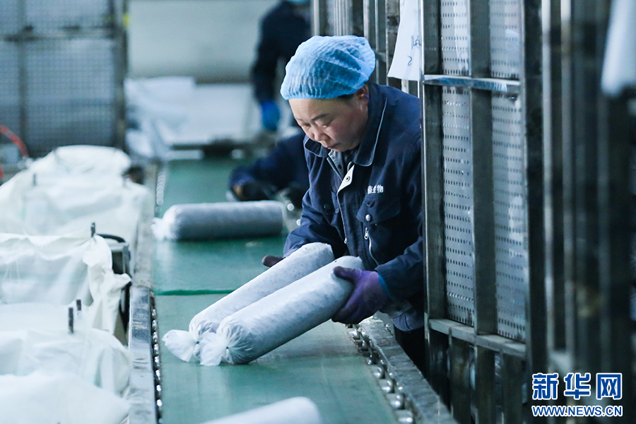 在岭南生物科技有限公司食用菌生产智慧工厂车间,作为工人的洛南当地村民搬运菌棒。新华网 杨喜龙 摄