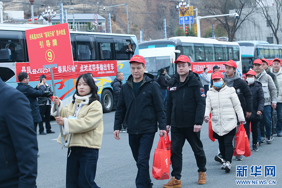 在丹凤县火车站广场上,657名外出务工人员乘坐15辆“春风行动”点对点务工专车,启程前往江苏南京、安徽芜湖、浙江温岭、西安等地,开启节后返岗务工之旅。新华网 杨喜龙 摄