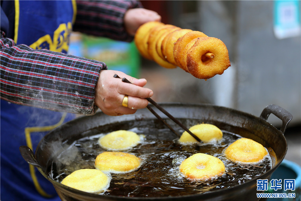 1月21日,店铺老板炸制陕北特色小吃“油馍馍”。新华网 王智超摄