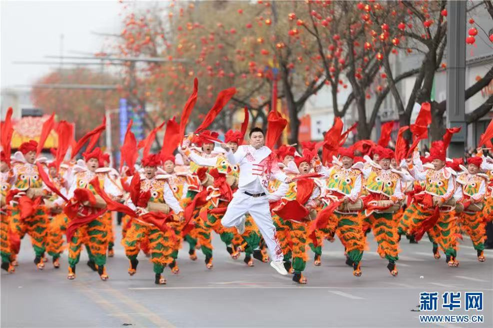 神木市秧歌队在街头为市民游客表演。新华网 王智超摄