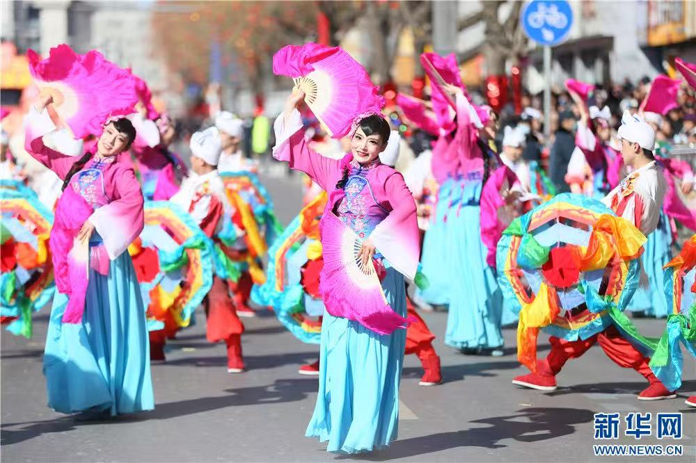 秧歌队在街头为市民游客表演。新华网 王智超摄