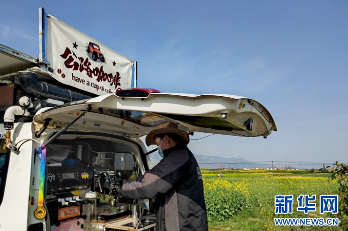 “花田集市”上,公路咖啡摊主正在制作咖啡。 新华社记者 孙正好 摄