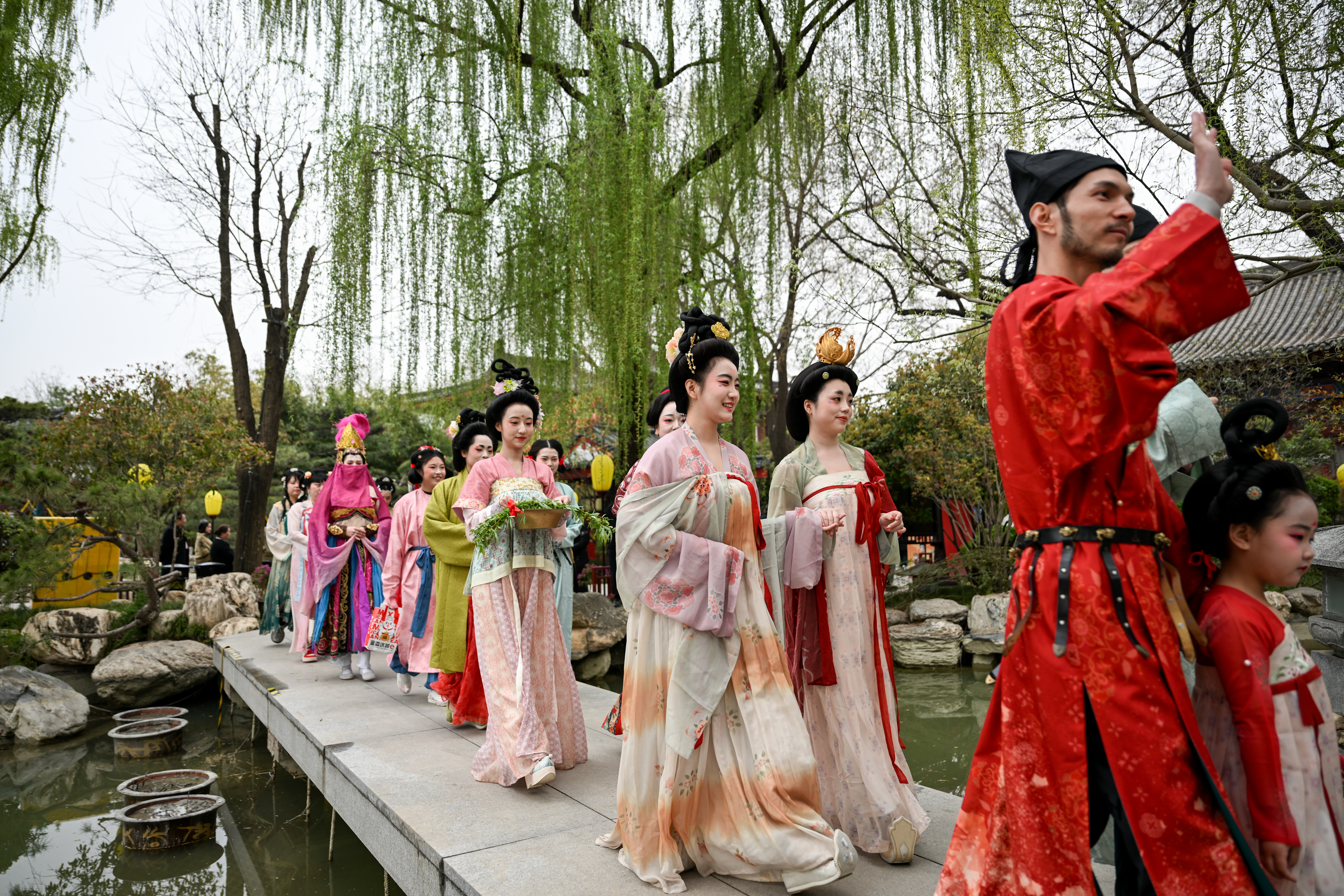 3月29日,以“盛唐华韵・上巳春嬉”为主题的华清宫第三届上巳节系列活动开启。当天,近百名汉服爱好者与“小花神”齐聚芙蓉湖畔,举行祓禊祈福仪式,以古人之礼体验盛唐文化。