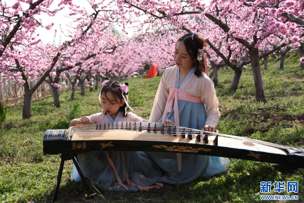 游客身着汉服在西安市鄠邑区柳泉口村桃花林下抚琴。王冰妍 摄