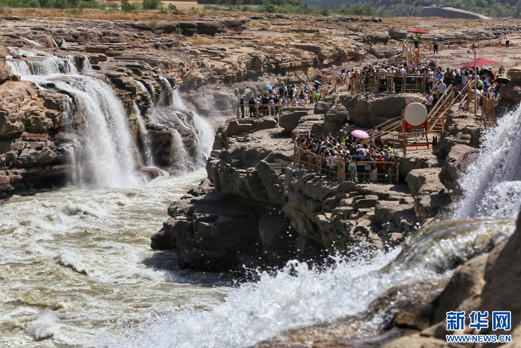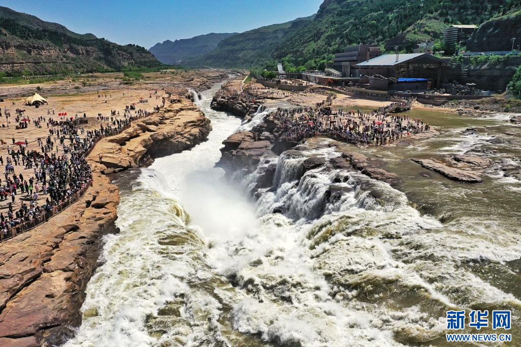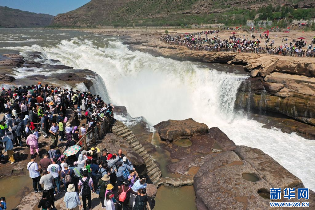 “五一”假期,位于陕西宜川县和山西吉县交界的黄河壶口瀑布正处于水势丰沛期,黄河水奔涌而下,气势雄伟壮观,吸引众多游客拍照留念。新华社发(王智超摄)