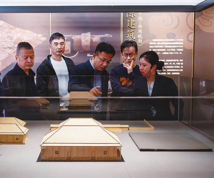 游客参观周原遗址召陈建筑基址复原模型