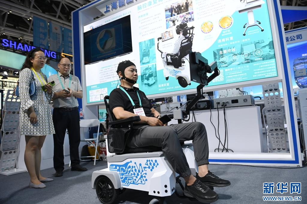 5月21日,在第九届丝绸之路国际博览会暨中国东西部合作与投资贸易洽谈会省际合作展上海市展区,工作人员演示脑控康复轮椅。