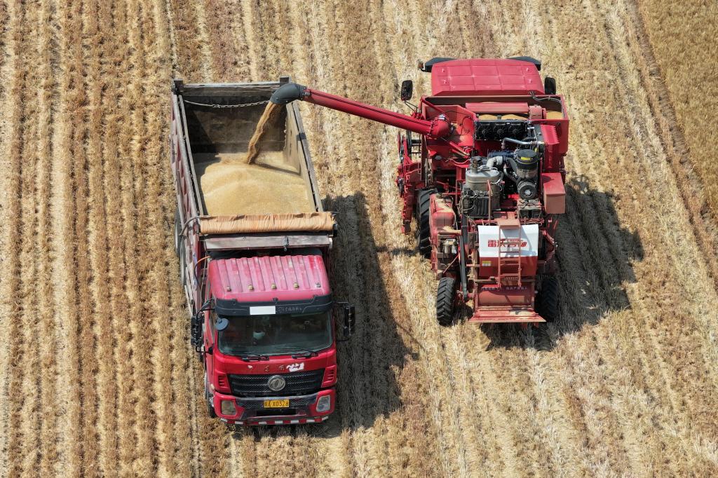 5月28日,在西安市鄠邑区庞光街道庞光村,收割机将收获的粮食装车(无人机照片)。新华社记者 邵瑞 摄