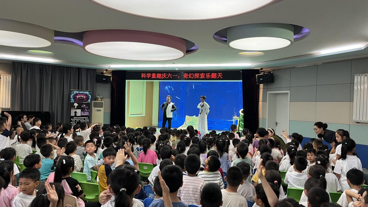 孩子们观看陕西科技馆专业团队带来的科学互动剧《疯狂实验室》。