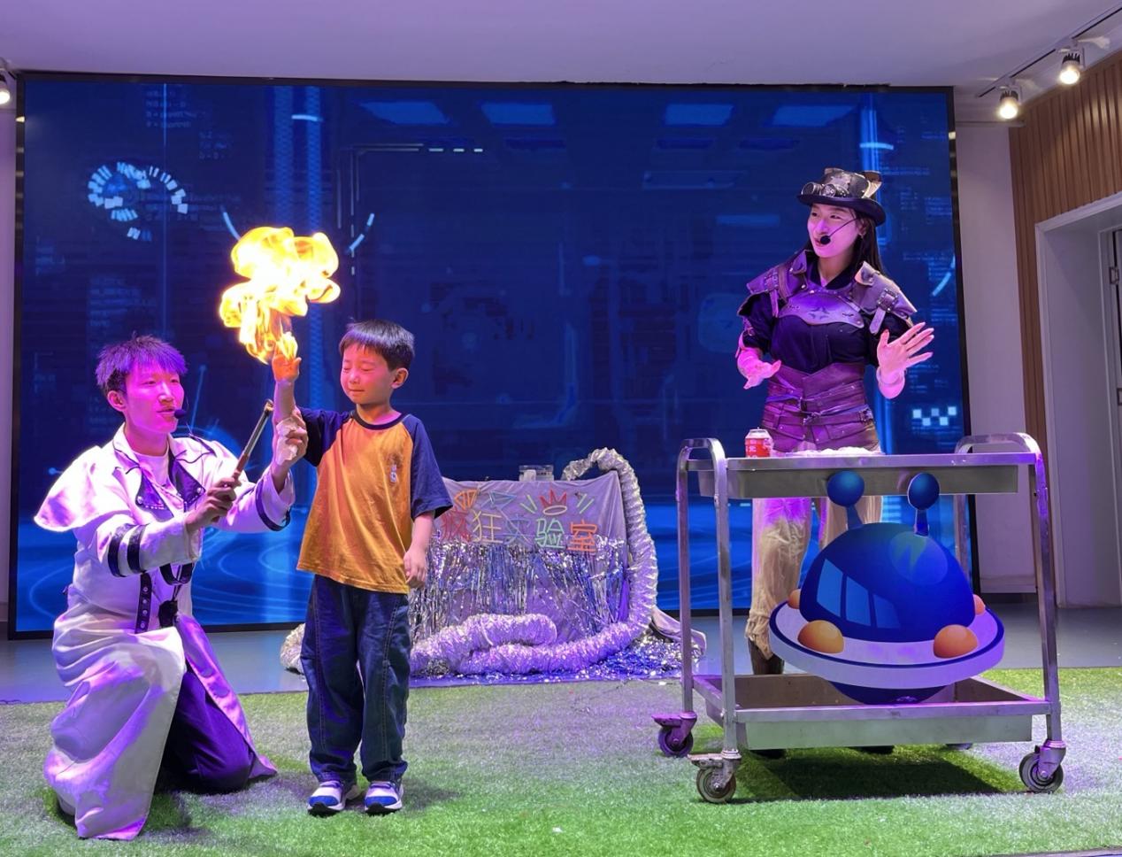 孩子们现场体验科学互动剧《疯狂实验室》。