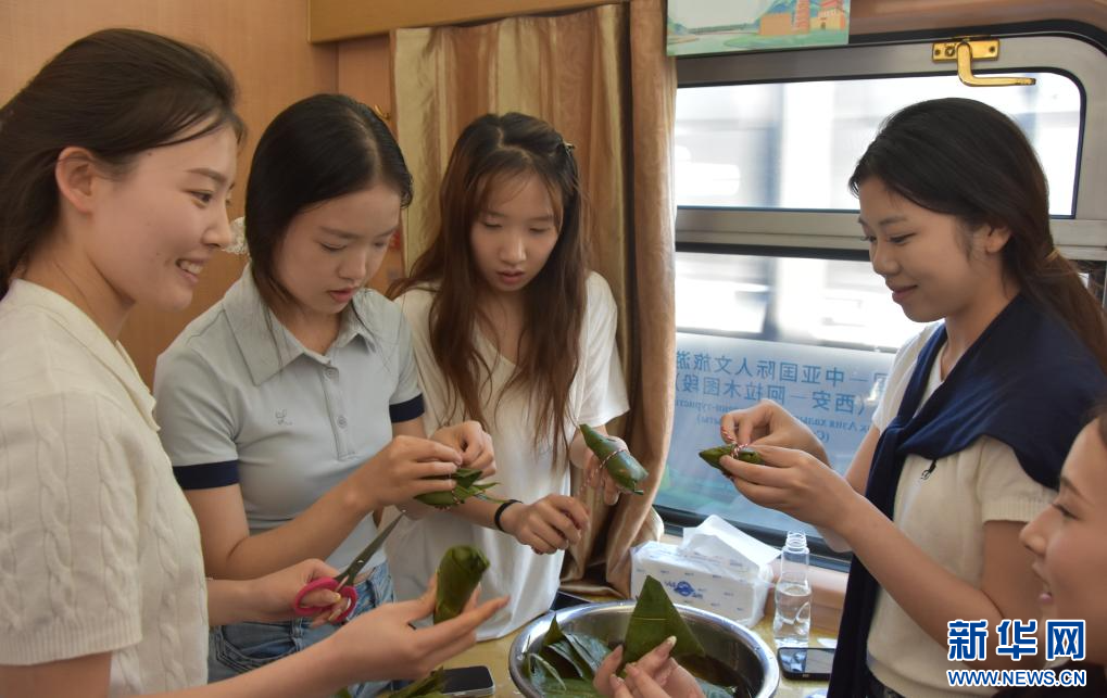 5月30日,在中国—中亚国际人文旅游专列(西安—阿拉木图段)上,乘客在包粽子。