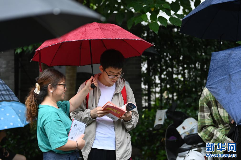 6月7日,在西安交通大学附属中学兴庆校区考点外,考生在考前复习。当日,2025年全国高考拉开帷幕。新华社记者 邹竞一 摄