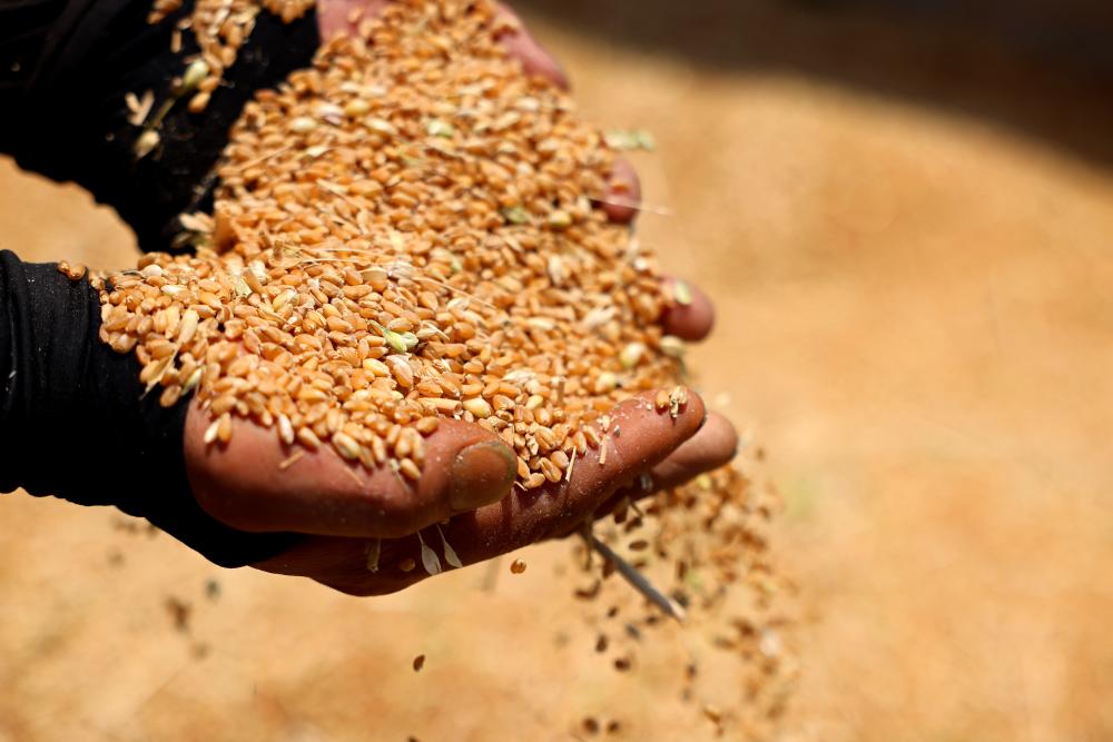 5月25日,在山东省枣庄市市中区税郭镇沙沟村麦田,农民展示刚刚收获的小麦。新华社发(孙中喆摄)