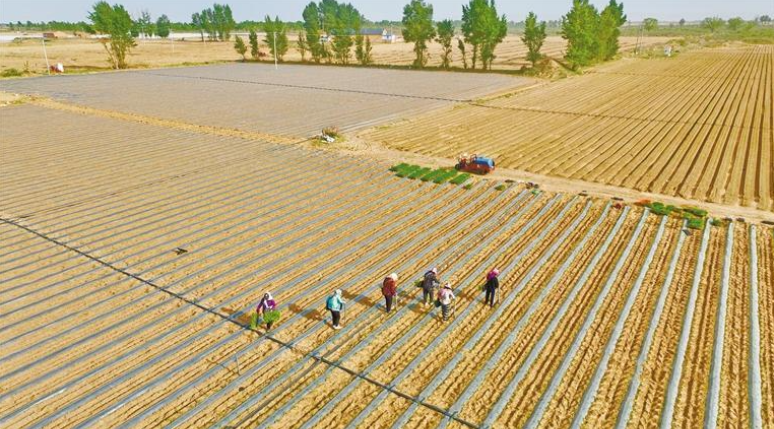 近日,在定边县白泥井镇衣食梁村的农田里,村民拿着移栽器移栽辣椒苗和西瓜苗。 通讯员 叶子摄
