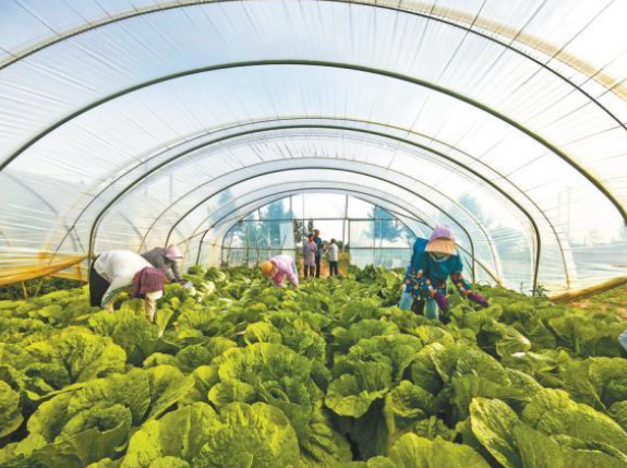 6月7日,靖边县东坑镇伊当湾村郭喜亮家的3棚大白菜迎来采收季。图为村民在大棚内采收白菜。 通讯员 陈治武摄