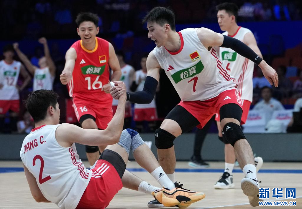 6月12日,中国队球员于垚辰(右二)和中国队球员江川(下)在比赛中庆祝得分。
