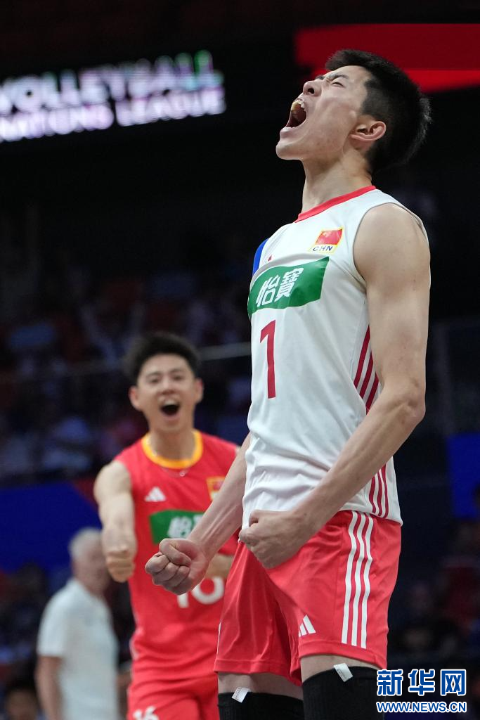 6月12日,中国队球员于垚辰在比赛中庆祝得分。