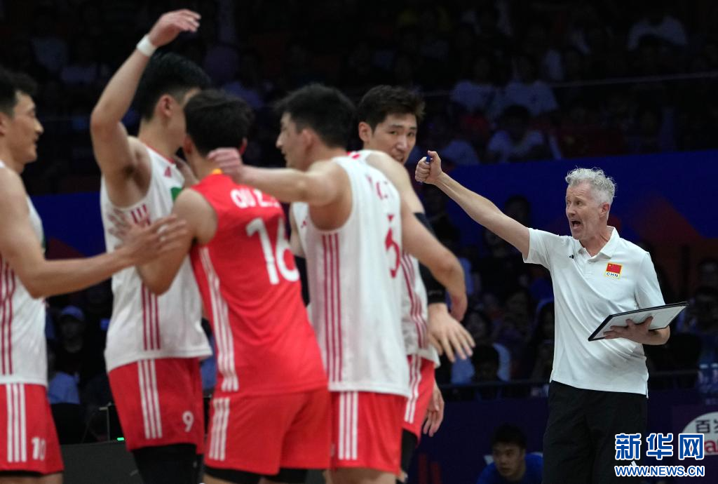 6月12日,中国队主教练维塔尔·海宁(右一)在比赛中庆祝得分。