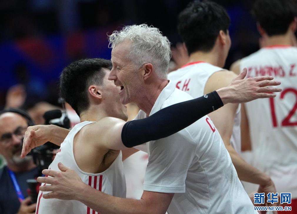6月12日,中国队主教练维塔尔·海宁(右)在比赛后与球员于垚辰拥抱庆祝。