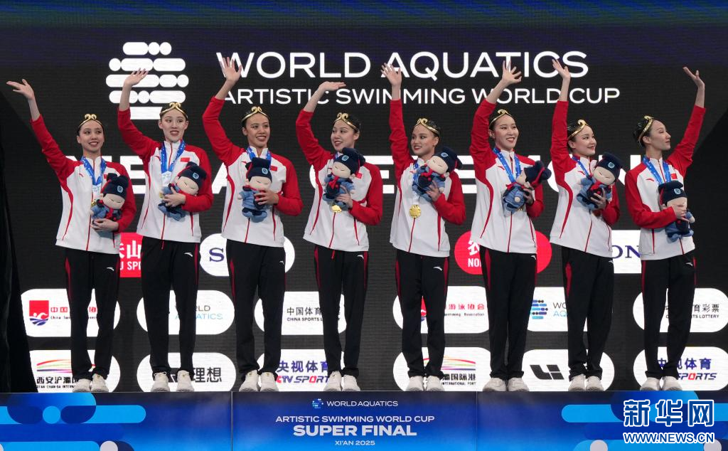 当日,在西安举行的2025年花样游泳世界杯总决赛集体技术自选决赛中,中国队夺得冠军。