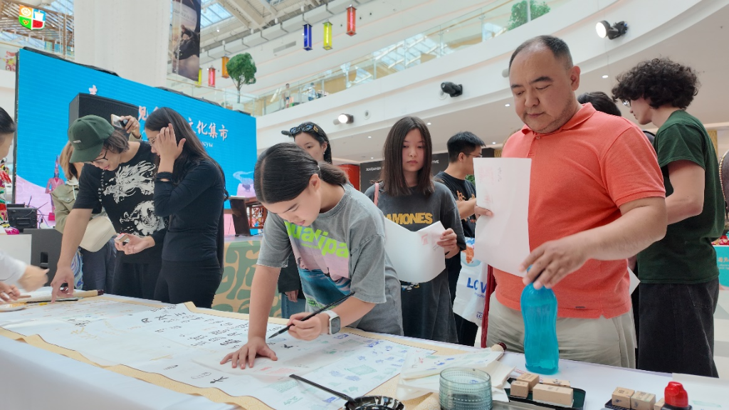 国之交在于民相亲。文化市集特别设置了“礼乐通关文牒”互动环节,让哈萨克斯坦广大民众通过亲手在宣纸上拓印“宅兹中国”等复刻纹样,了解青铜文化。现场还准备了毛笔、墨汁,以及3米长的“青铜遇见金人”丝路长卷,不少外国友人手握毛笔,精心绘制出他们心中的中哈友谊标识。