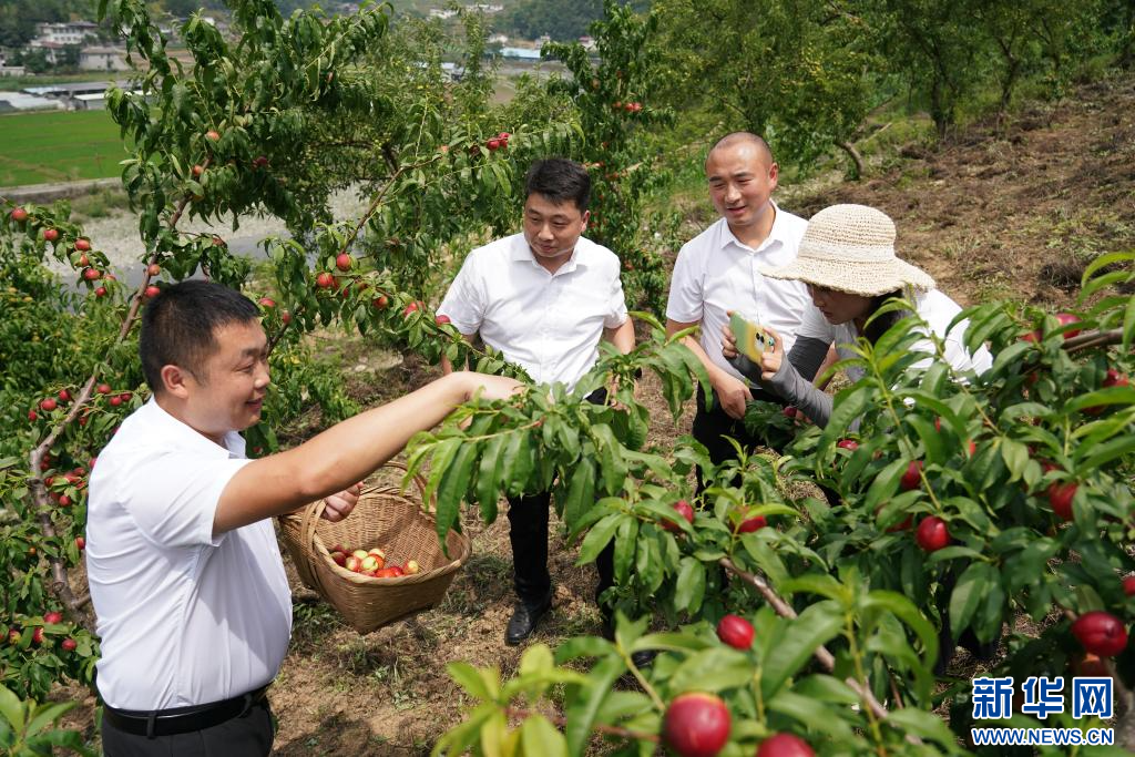 6月24日,在安康市岚皋县孟石岭镇丰景村,岚皋县孟石岭镇前进村第一书记韩超(左一)、岚皋县孟石岭镇丰景村第一书记苏垚(左二)、岚皋县民主镇枣树村第一书记祝振弟(左三)在拍摄创作用于桃子销售的短视频。