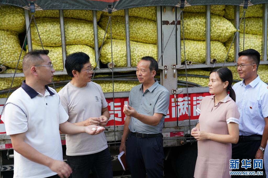 6月23日,在安康市汉阴县涧池镇五坪村,来自汉阴县涧池镇、蒲溪镇等地的多名第一书记在装车的蚕茧前交流。
