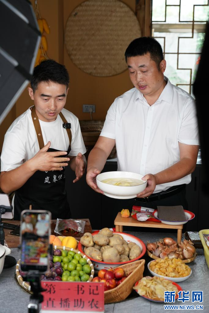 6月24日,在安康市岚皋县孟石岭镇电商直播基地,岚皋县孟石岭镇前进村第一书记韩超(右)与电商主播一起直播销售当地农特产品。