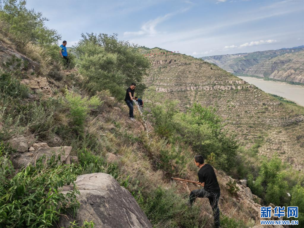 黄河西岸,一处斜坡近百米高,坡度近50度,土质松软,人踩上去有些站不稳。队员郝雷拎起锄头,小心翼翼地下到斜坡中间地带,给一棵棵长势苍翠的白皮松掏土、堆坑。另一边,同伴们接好水管,拧开阀门,一股股清流“告别”停在坡顶的拉水车,沿着20多米的管道,渗进了树苗根部。“今年陕北雨少天旱,我们得多浇几次水,争取让每棵树都能活下来。”郝雷说。