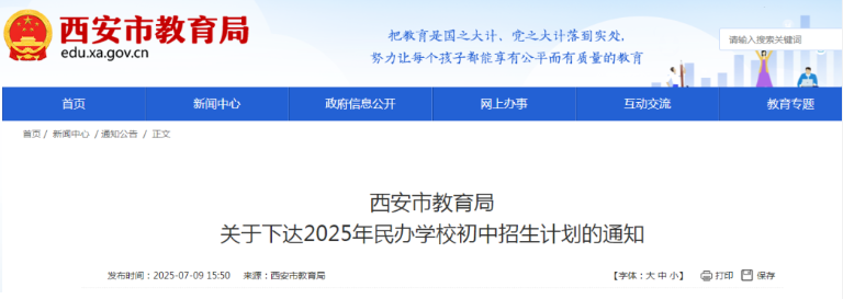 7月9日,西安市教育局网站发布关于下达2025年民办学校初中招生计划的通知
