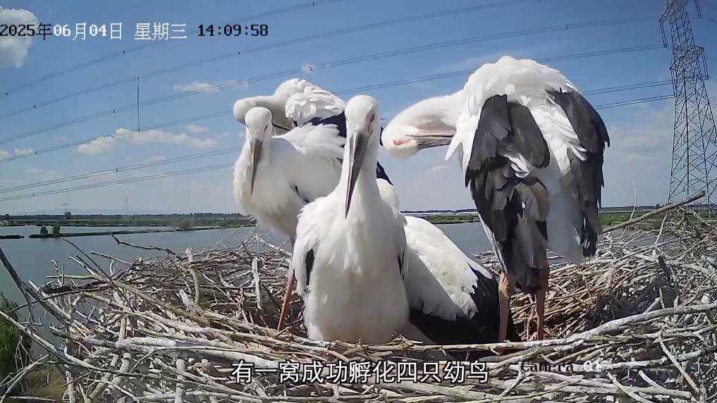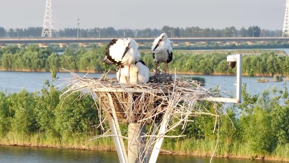 在辽宁省盘锦市盘山县绕阳河胡家镇段,有六个人工修建的鸟巢,其中一个鸟巢里生活着有“鸟中国宝”之称的东方白鹳。