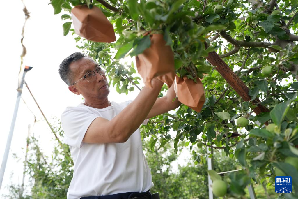 6月10日,果农曹谢虎在位于陕西省渭南市白水县林皋镇的果园里给苹果套袋。新华社记者 李一博 摄