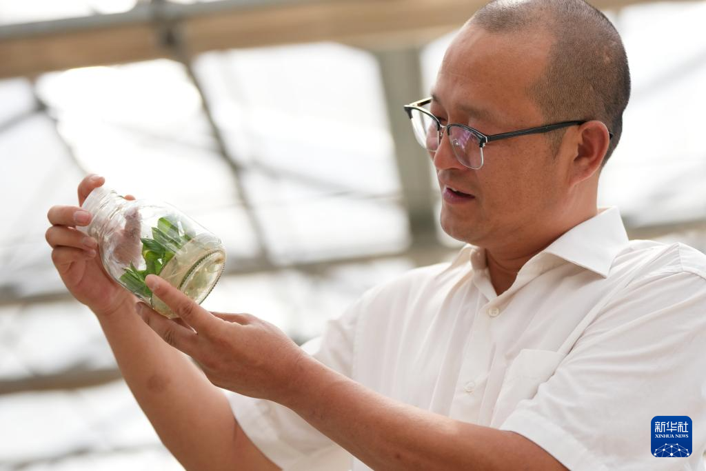 6月10日,在陕西省渭南市白水县兴华果蔬有限责任公司,副总经理成永勤查看组培脱毒的苹果砧木苗生长情况。新华社记者 李一博 摄